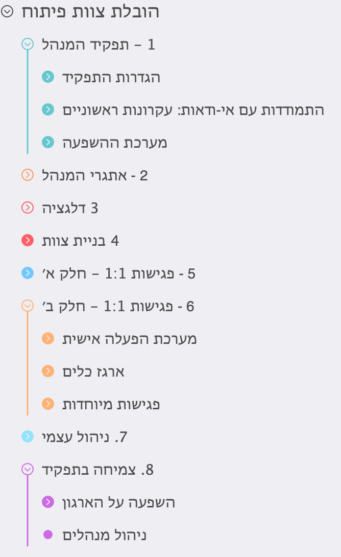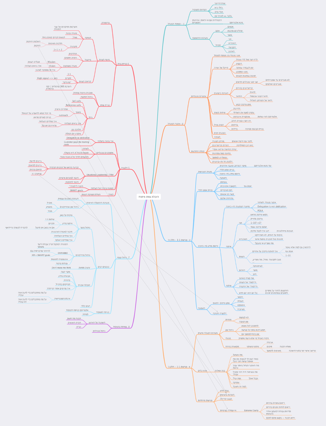 לאט לאט התוכן הסתדר במבנה לוגי. כדי לעזור לתהליך סיכמתי את הכותרות השונות בmind-map, מה שהקל על הסידור והזזת התוכן ממקום למקום. לאורך כל התהליך וידאתי שיש לי מנגנוני קבלת פידבק כדי שהאיטרציות יתכנסו למבנה מועיל ואפקטיבי. לשם כך שיתפתי את התוכן הן עם מנהלים ומנהלות שעברו לאחרונה מפיתוח לניהול, והן עם מנהלים ומנהלות בעלי ובעלות ניסיון רב מאוד.